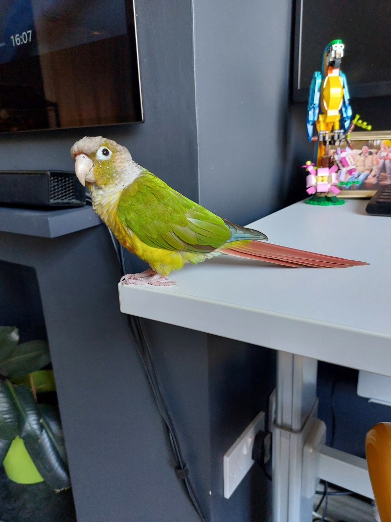 Freddie is a 3 year old green cheek conure of the rainbow fabulous variety (or pineapple if you want to use the actual term). He’s a very beautiful boy and sort of looks like the type of bird you might have coloured in as a child, not imagining that such a fabulous combo might actually exist in the real world. It’s quite hard to capture his fabulousness on camera so, if you’re not already familiar with them, I’d encourage you to look up pineapple conures on Google to see them in all their glory!